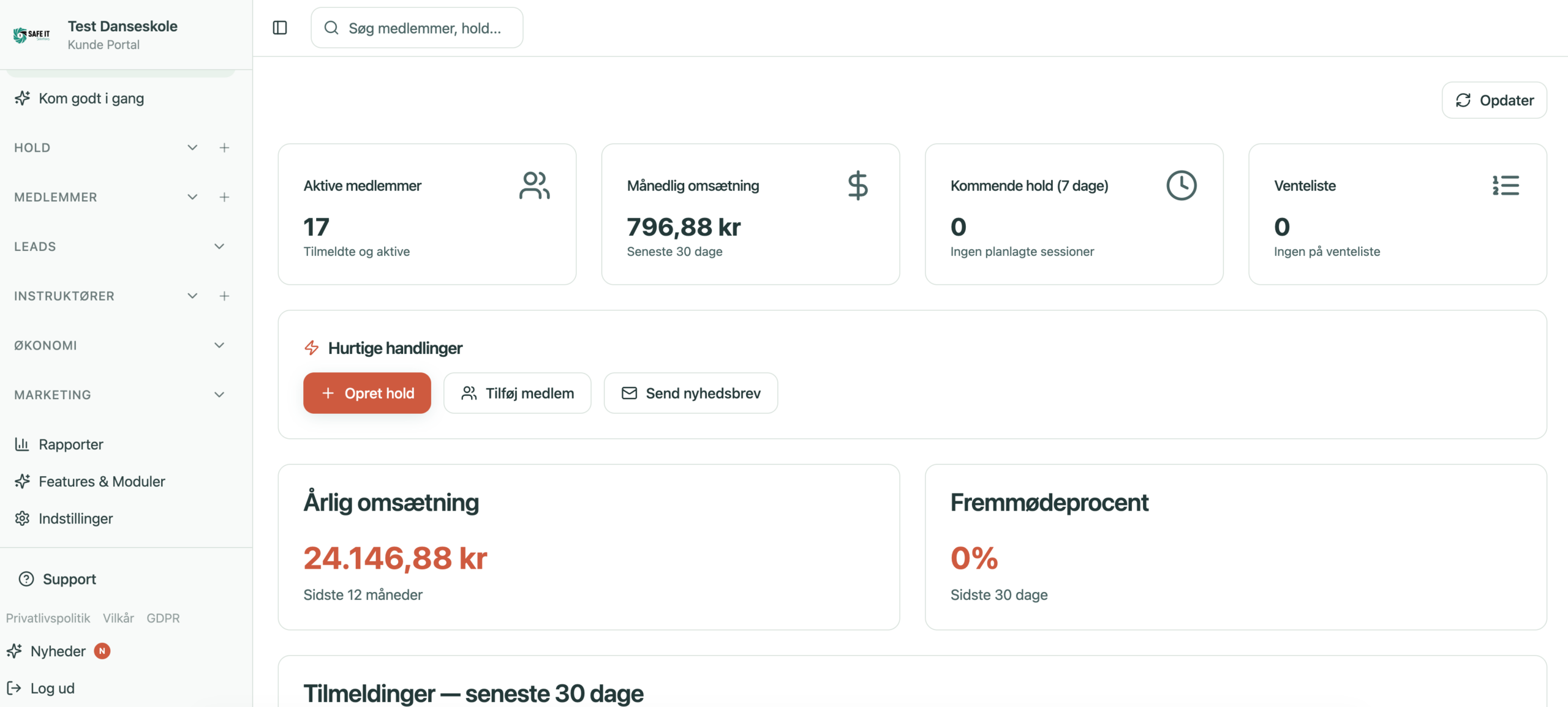 Nye medlemmer kan nemt tilmelde sig, betalinger kører automatisk, og du kan oprette både hold, sæsoner og events på få minutter.